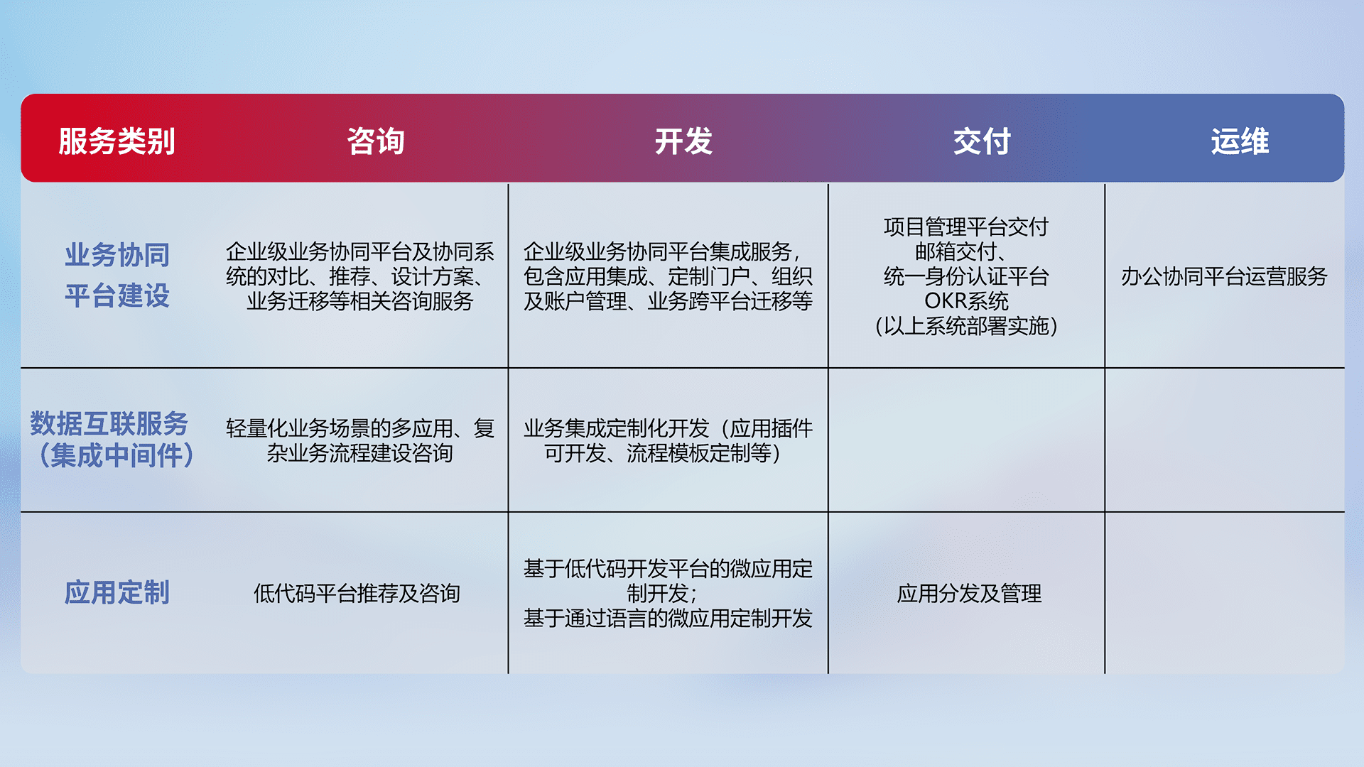 针对钉钉、、、、企微、、IDaas等平台级产品提供产品的规划、、方案、、交付、、定制化开发等服务,,,,实现如统一协同办公、、智能客户服务、、混合会议管理、、、智能数据查询、、、等业务场景,,,,实现数字化转型。。。